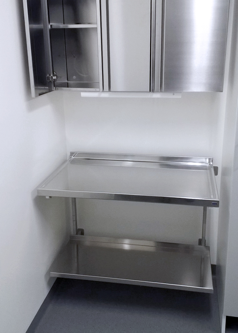 Rustfri underhylla med oppbrettet bakkant og nedbrettede sider samt frontkant.