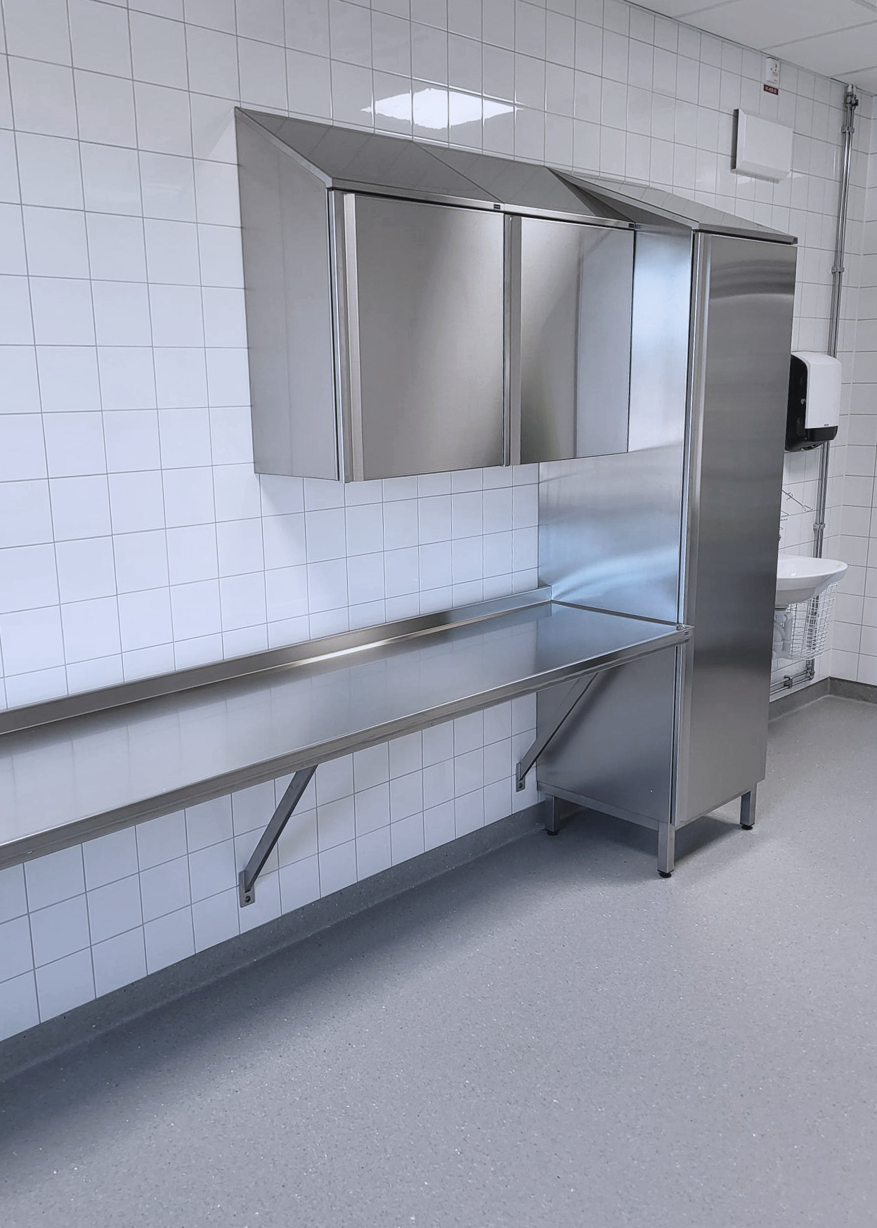 - Produseres helt i rustfritt stål i kvalitet EN 1.4301, helt uten organiske materialer. Se Variantutførelse for benkeplater i syrefast rustfritt stål, EN 1.4404.