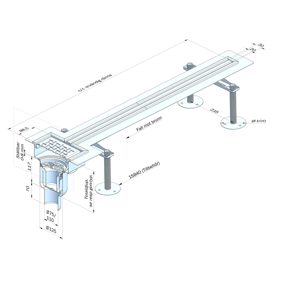 Smal gulvrenne i rustfritt stål, ideell for svømmehaller, dusjer, garderober samt rundt bassenger og svømmebassenger. Tilgjengelig modulsystem for fleksibilitet og tilpasning etter spesifikke behov.