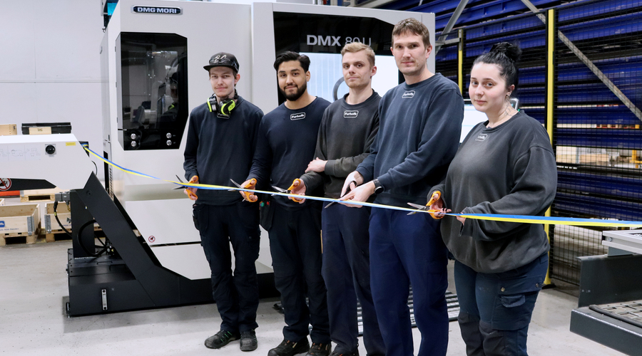 I fredags hölls invigning på vår avdelning för skärande bearbetning! Våra operatörer Lukas, Hussain, Oliver, Marcus och Natalie klippte ett blågult band framför vår nya femaxliga fräs DMG MORI DMX 80U.