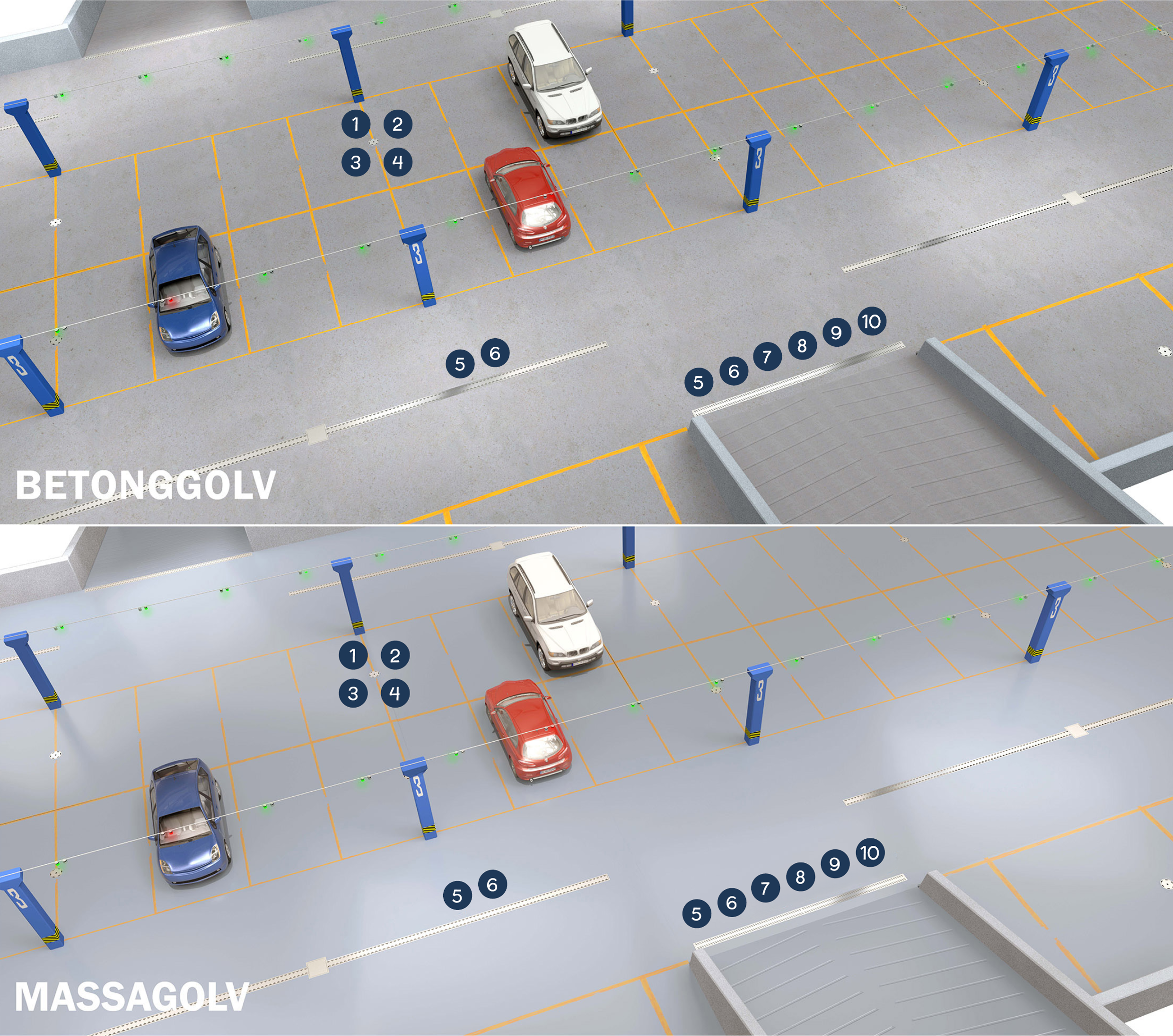 Furhoffs produkter är robusta och konstruerade för att tåla tung trafik och omfattande slitage, vilket gör dem idealiska för intensiva miljöer som parkeringshus.